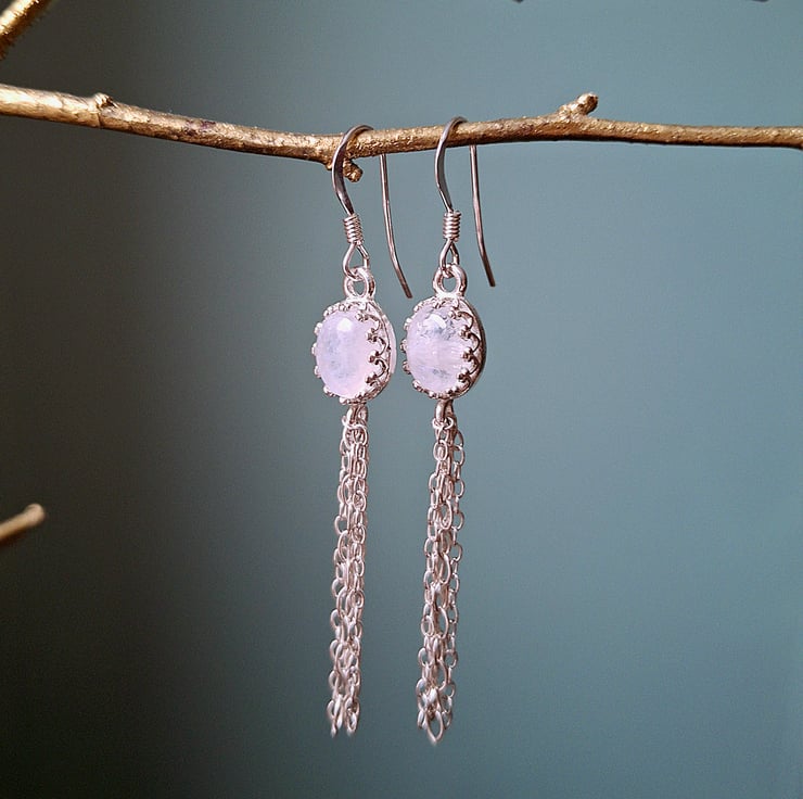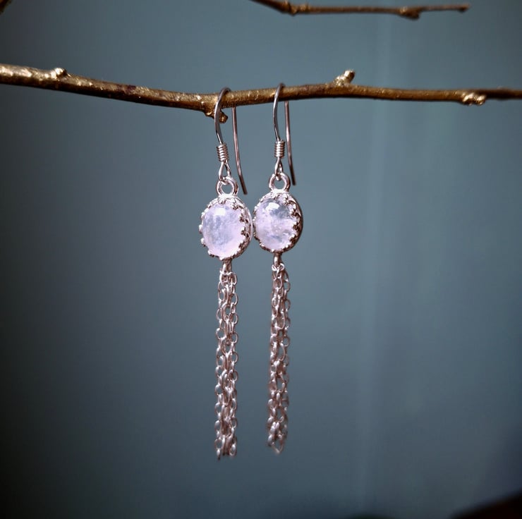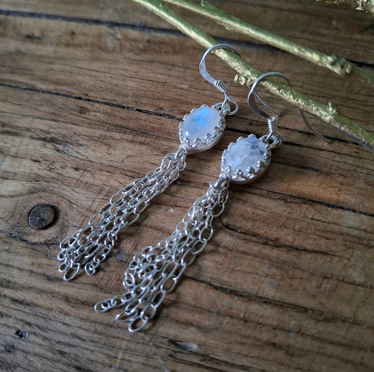 The moonstones have a blue shimmer when the light hits. To give it a bit of an edgy alternative looks, the tassels are made with different types of chain.