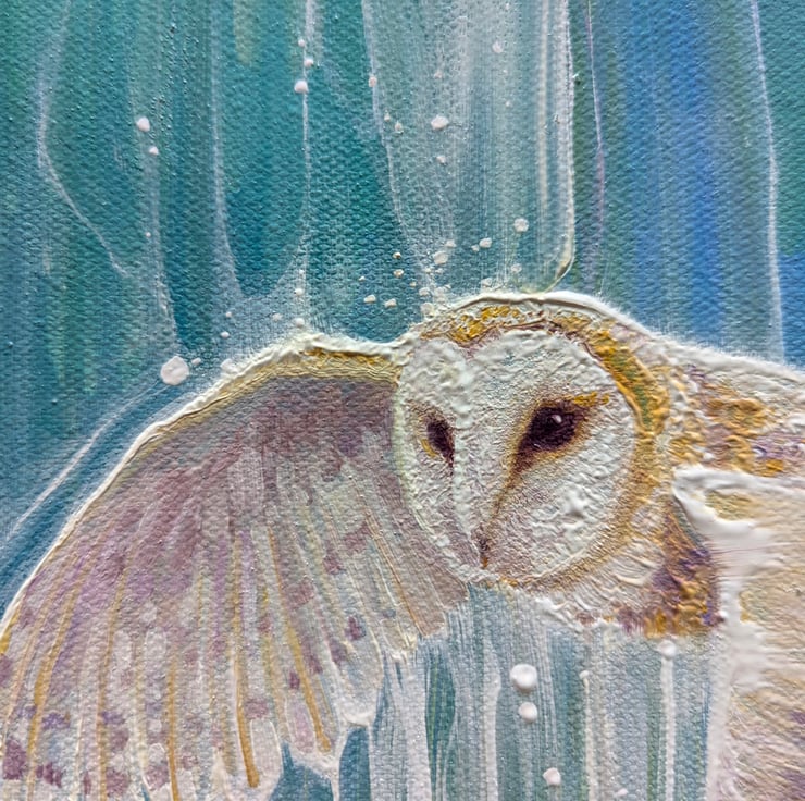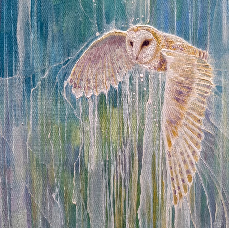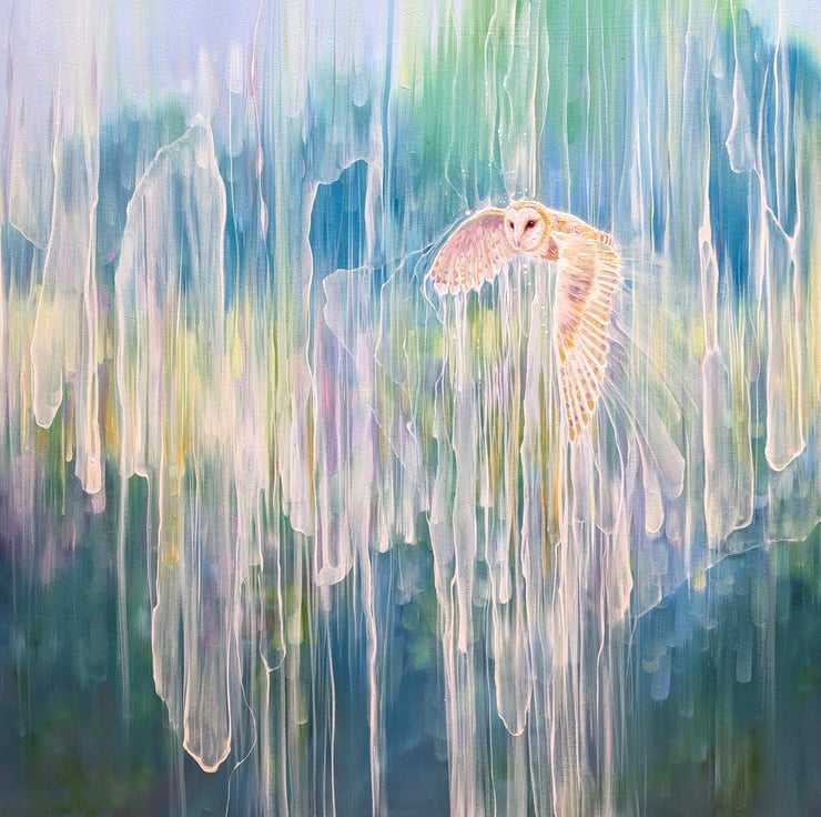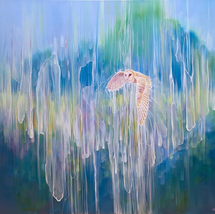 The Owls Symphony is a semi-abstract, art nouveau, magical realism owl painting