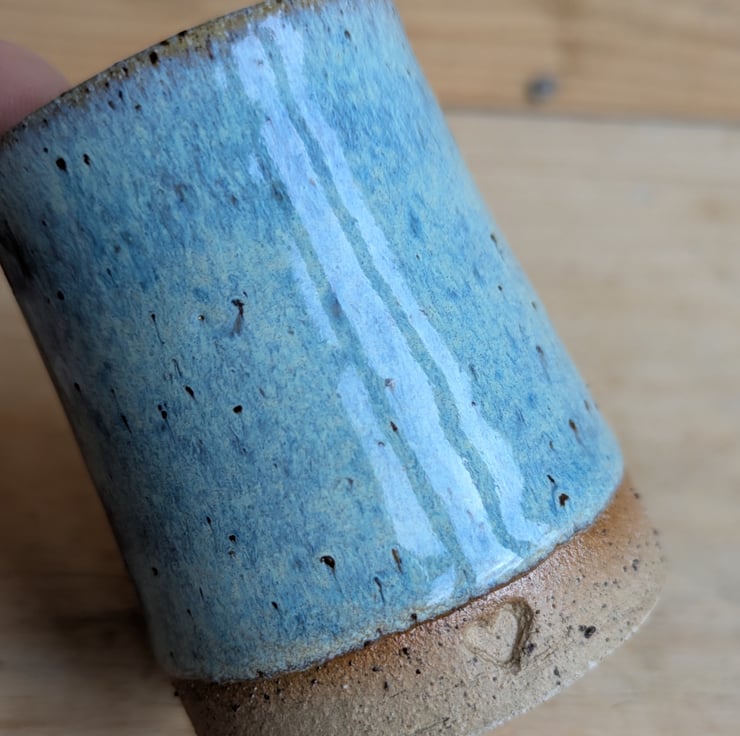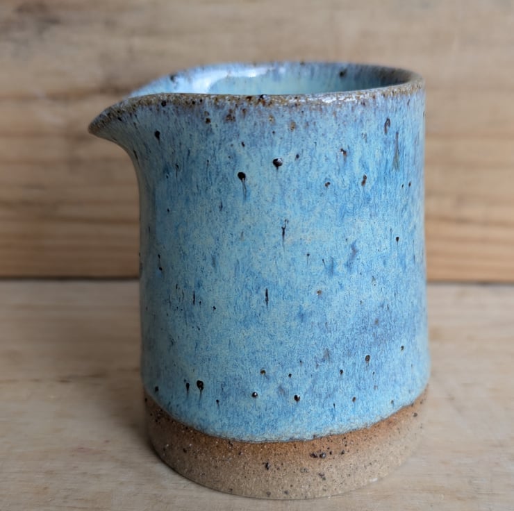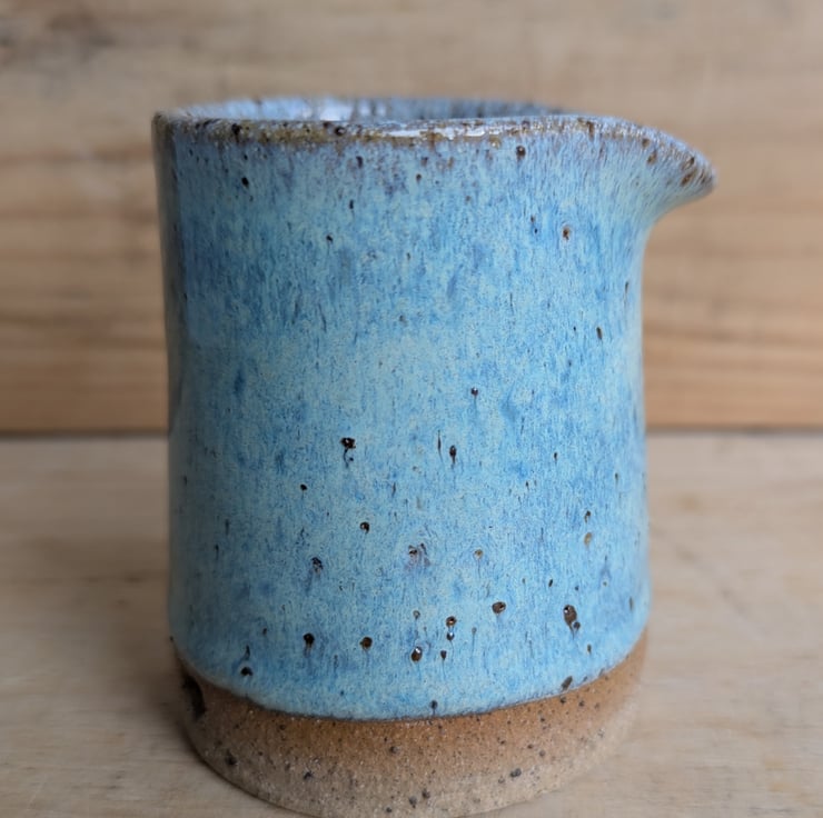 Great wee speckled clay jugs in a pale turquoise green glaze. It's more green than the photo shows it but I love this colour! Ideal size for milk/cream, perfect for one! Fired to c1200 degrees (stoneware temperature) and this makes it more durable.