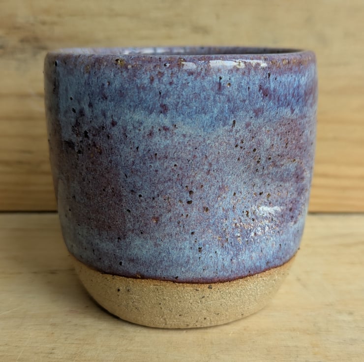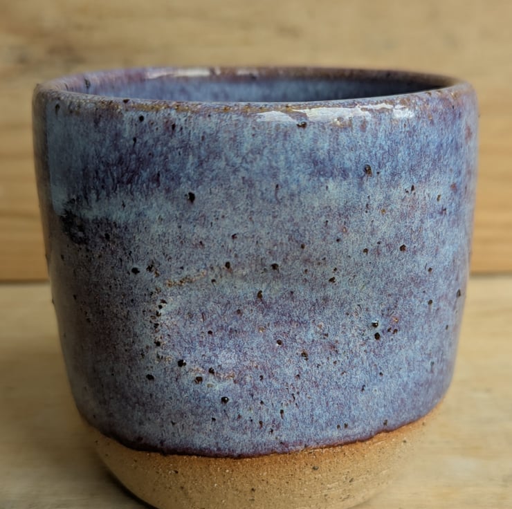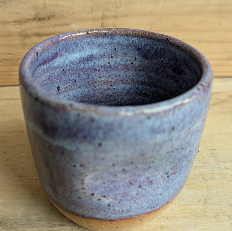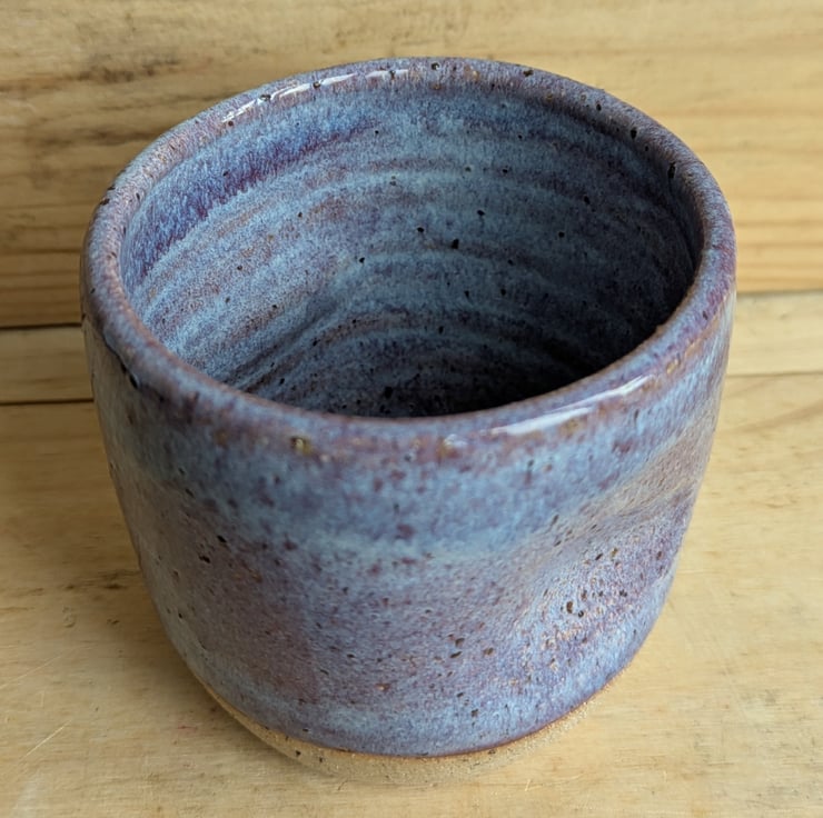 A small purple tumbler...although the photo is more bluey! Ideal for water or wine, with indents for your finger and thumb. I make the indentations using a pebble from the beach. I made 6 of these, all different colours and this is the only one left. Have used a speckled glaze and some of the speckles show through the glaze. Fired to c1200 degrees (stoneware temperature) and this makes it more durable.