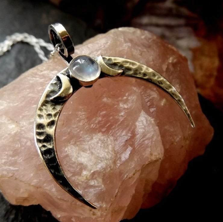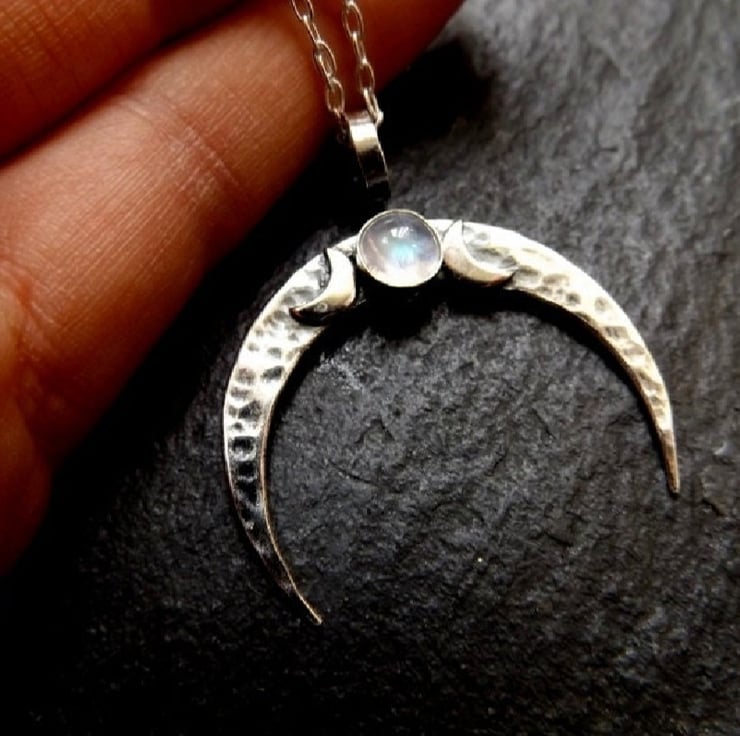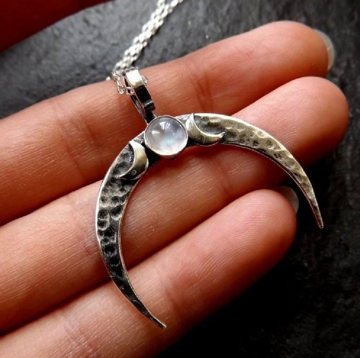 The triplemoon necklace is a very celestial and powerful piece , and the addition of a glowing gemstone brings life to this piece, and hammered silver adds to the sparkle