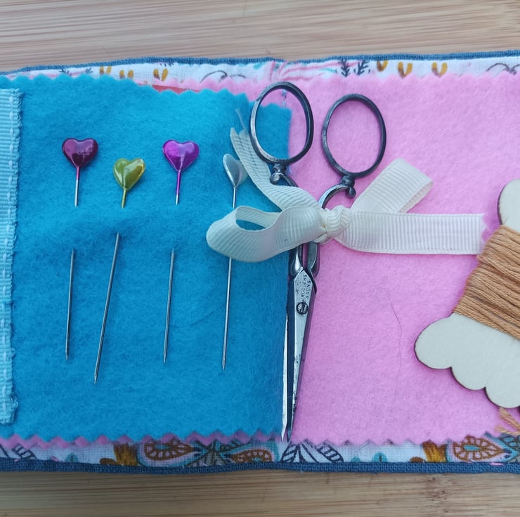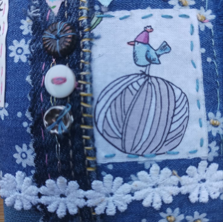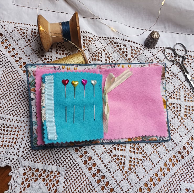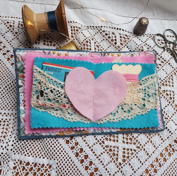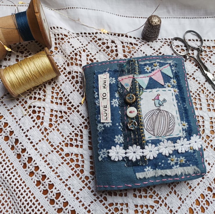 Handmade needlecase with hand sewn detail. It has a 'love to knit' embroidered message and layers of found fabric artistical arranged and hand sewn. Made from sewing scraps and found ribbon. This beautiful item which would look great in any craft space as well as being very useful for needle storage.