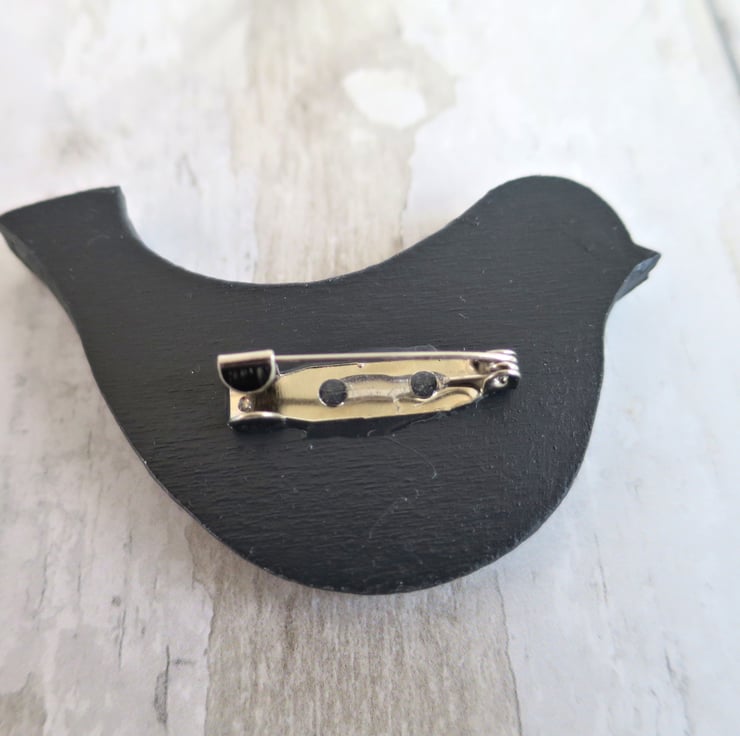 Set on a base of ply, the back is painted dark grey and a silver coloured brooch pin attached.