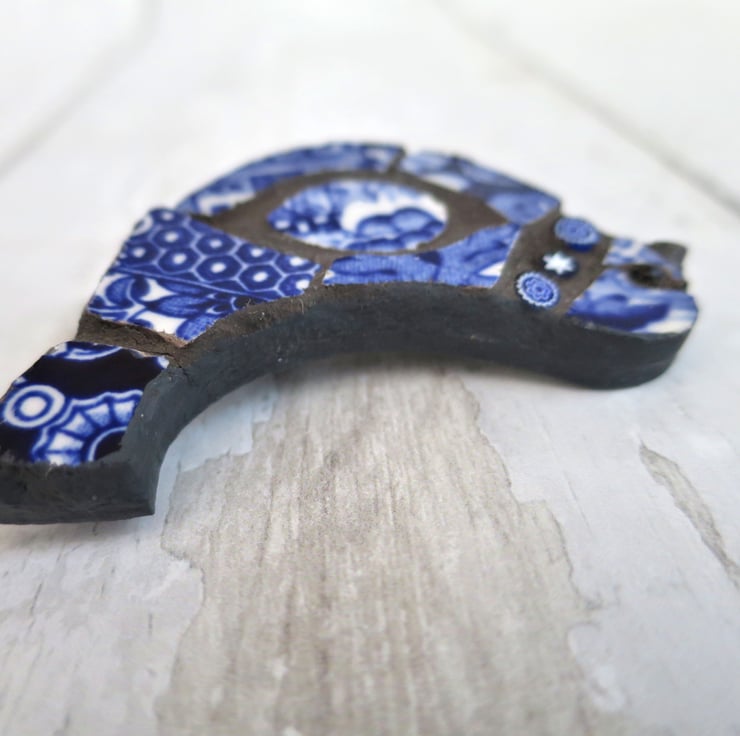 A handmade, mosaic bird shaped brooch made with beautiful blue and white vintage plates. This unique decorative jewellery would make a wonderful little gift or unique piece of jewellery to treasure.