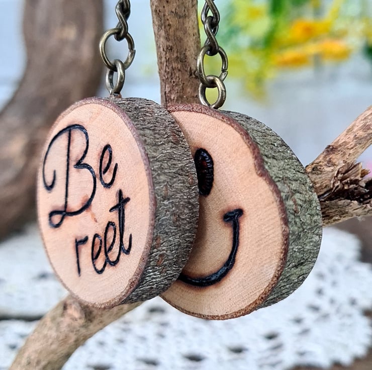Pyrography is used to hand burn the designs on both sides of a live edge log slice, with the addition of a chain and keyring all together makes for a unique piece