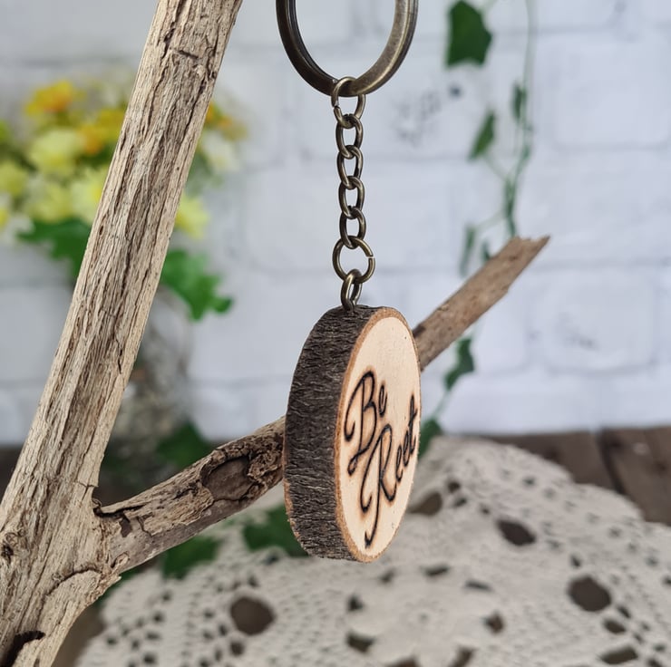 Pyrography is used to hand burn the design onto both sides of a live edge log slice, with the addition of a chain and keyring all together makes for a unique piece