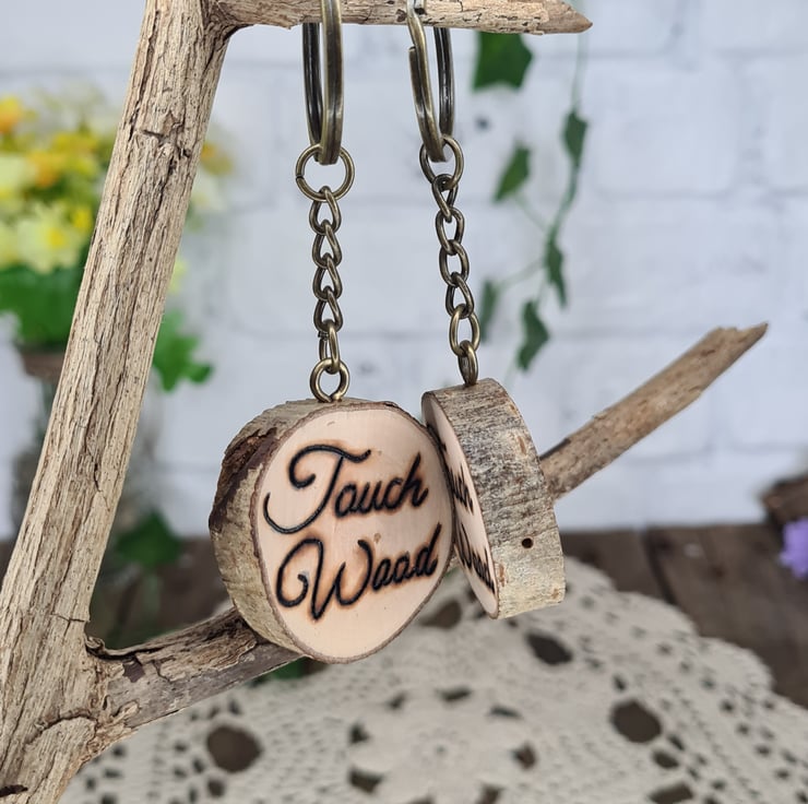 A fun and inspiring addition to the keys and the mind, this hand burned keyring will satisfy your superstitious side should you need some wood to touch!