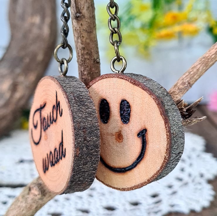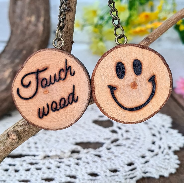 A fun and inspiring addition to the keys and the mind, this hand burned keyring will satisfy your superstitious side should you need some wood to touch!