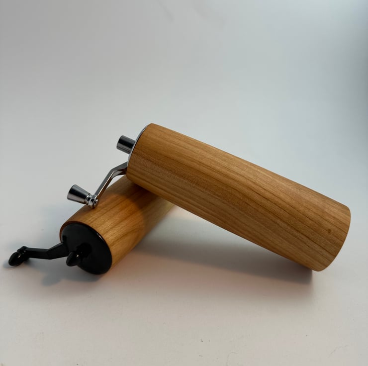 Salt and pepper grinders in cherry. They are 6 inches tall and have ceramic grinders so are suitable for salt as well as pepper.