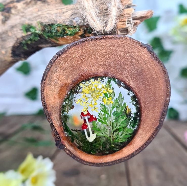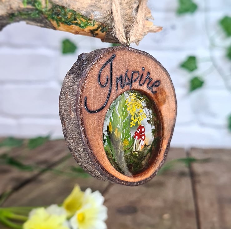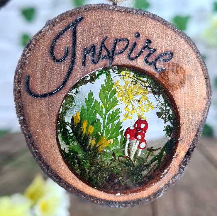 Pyrography is used to hand burn the word ‘inspire’ onto a live edge log slice, resin encases real dried flowers, moss, and hand painted mushrooms inside the log slice, which all together makes for a unique piece