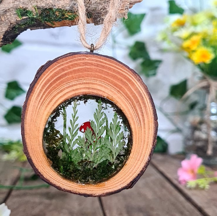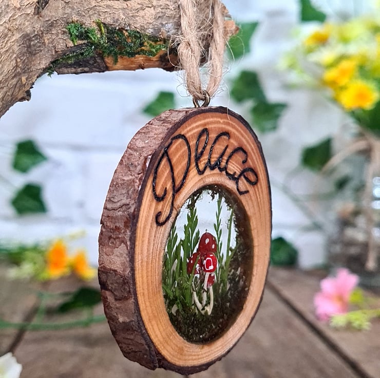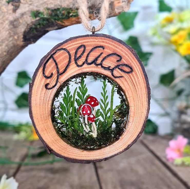 Pyrography is used to hand burn the word ‘peace’ onto a live edge log slice, resin encases real dried flowers, moss, and hand painted mushrooms inside the log slice, which all together makes for a unique piece