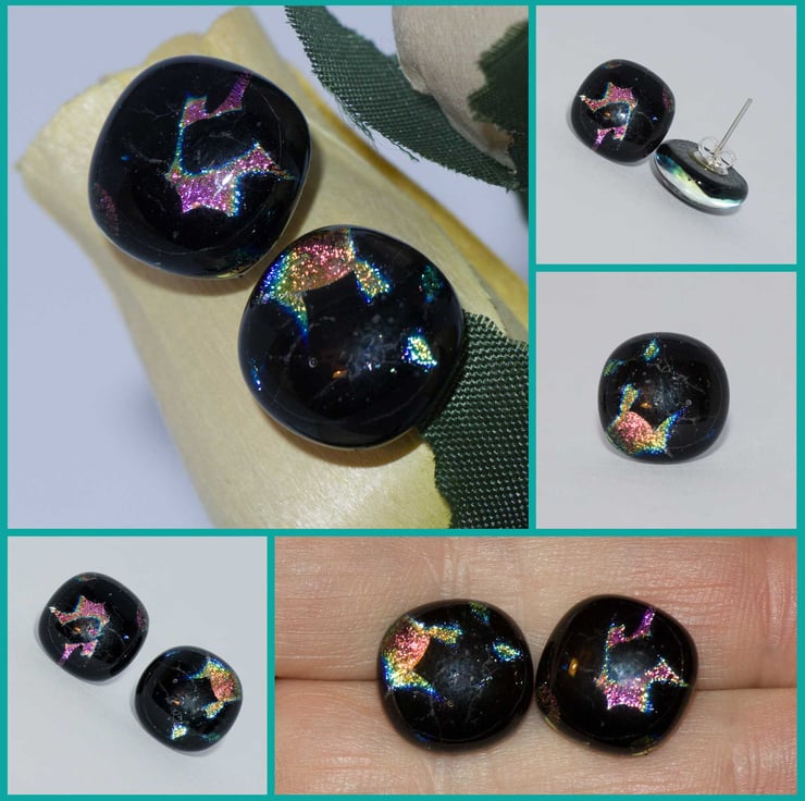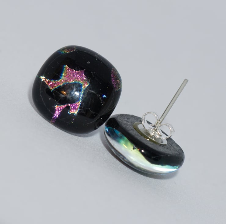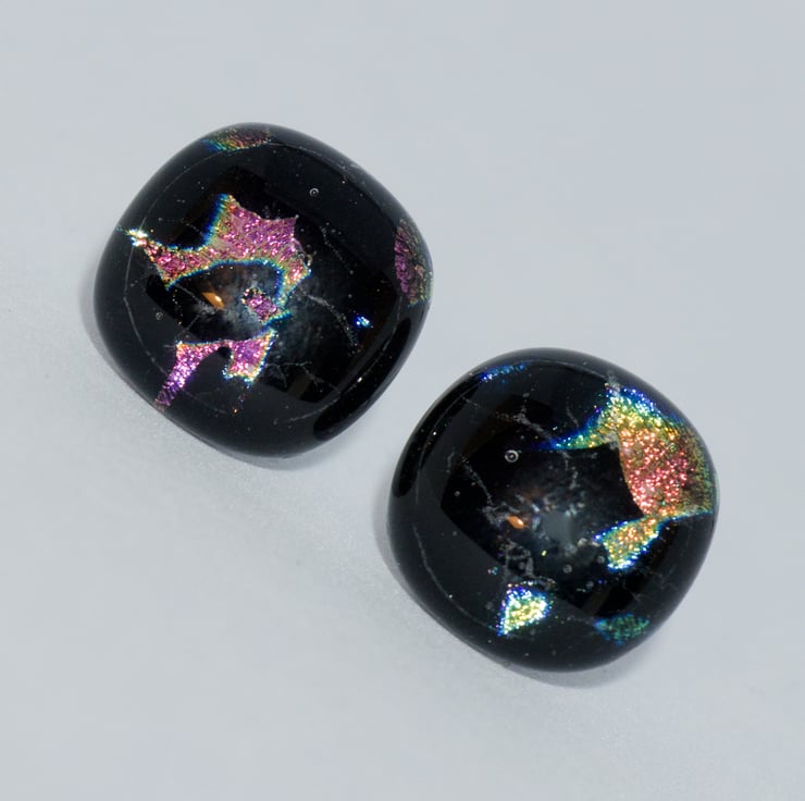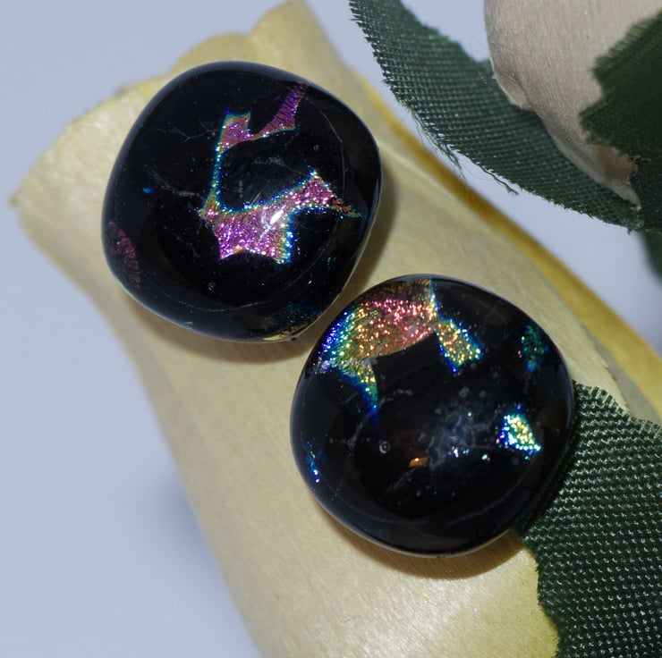 An unusual design -these earrings have fragments of dichroic colour on a black base. They catch the light beautifully and will add a sparkle to any outfit.