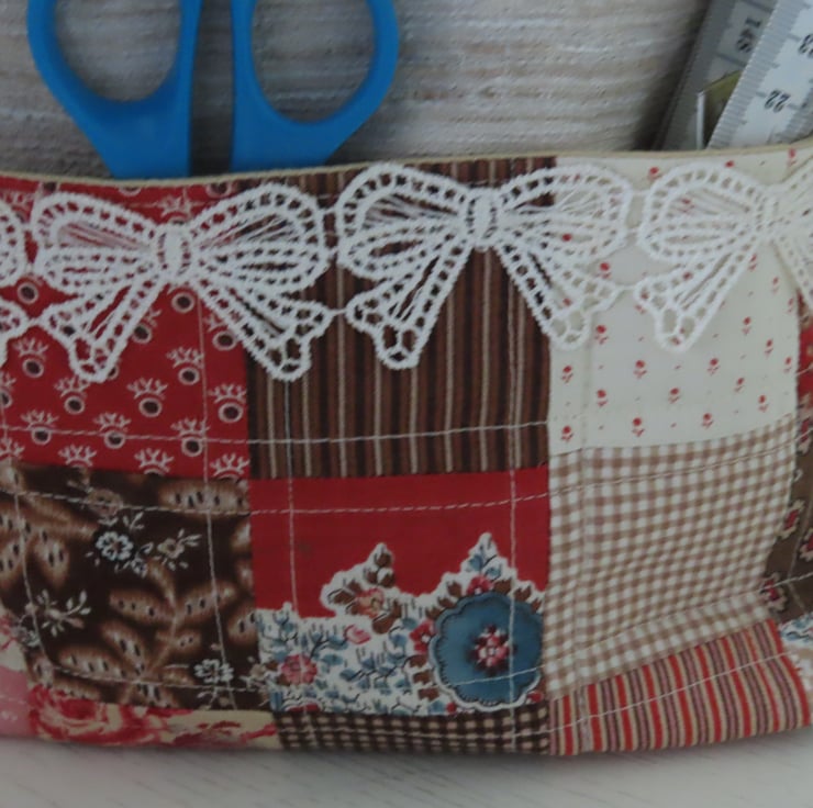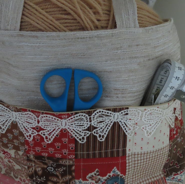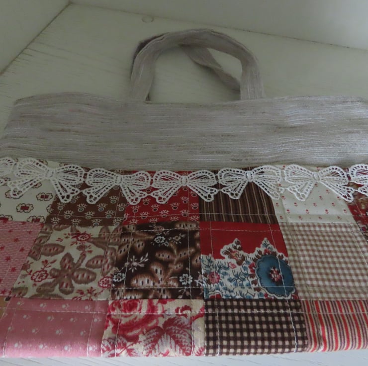 The front pockets are traditional patchwork in reds and browns, accentuated by cream lace. The main body of the bag is made from rescued, upholstery fabric remnants.