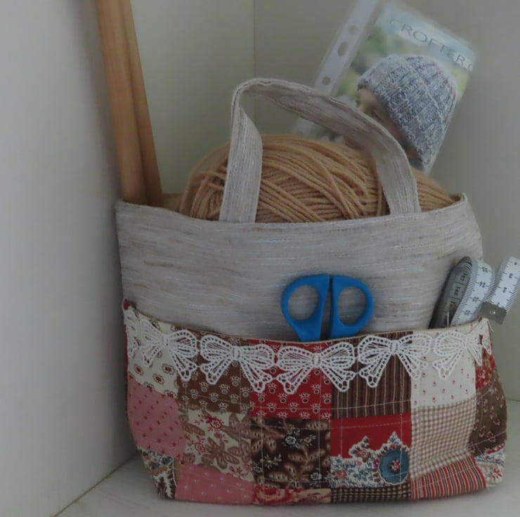 This knitting bag is for storing an ongoing project and is large enough for 2 - 3 balls of yarn, needles and a pattern. There are also three pockets at the front for small tools such as scissors and a tape measure etc. It is ideal for taking your project to classes or 'knit and natter' groups.