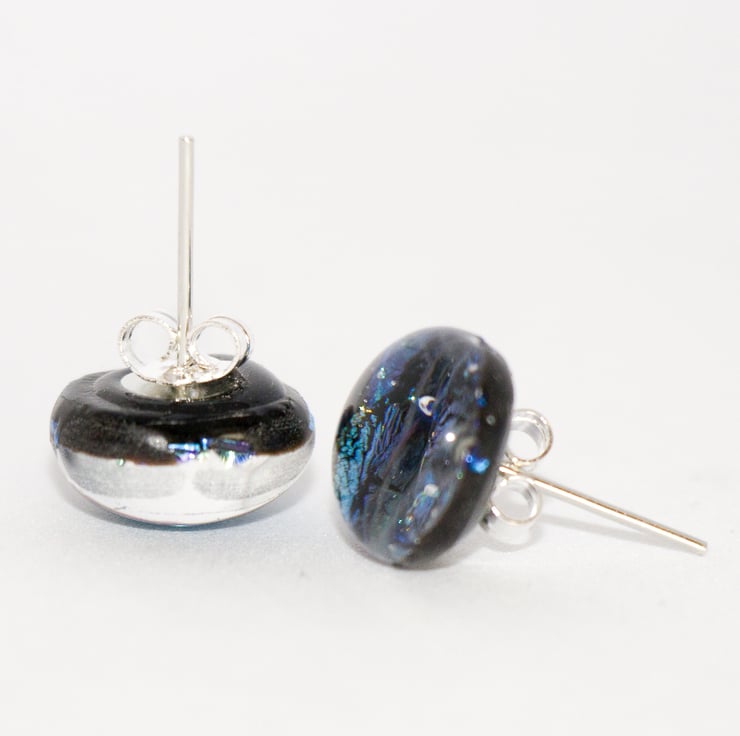 Each earring is a rounded square measuring approximately 1.2 cm across and is made from hand-cut glass fused at around 800C in our kiln. This process creates a totally smooth surface.