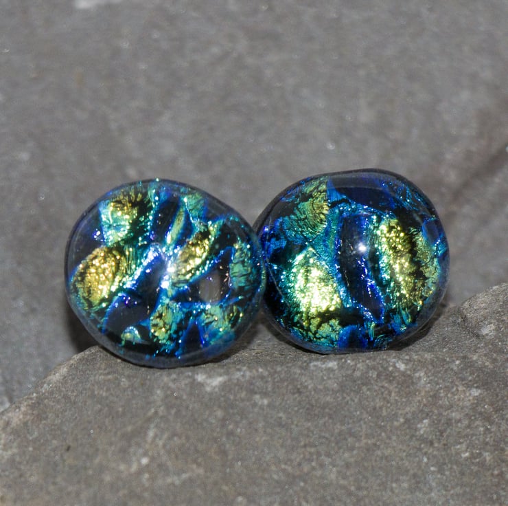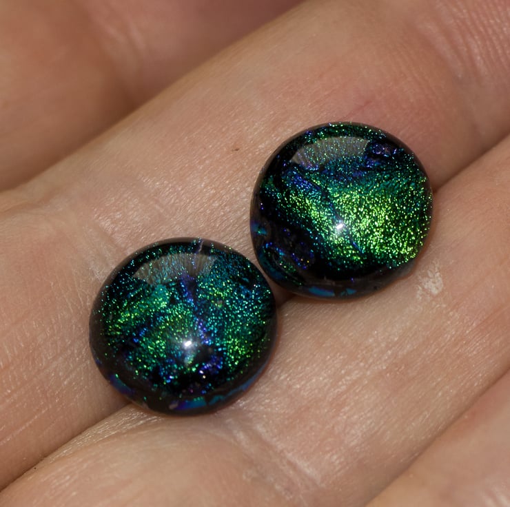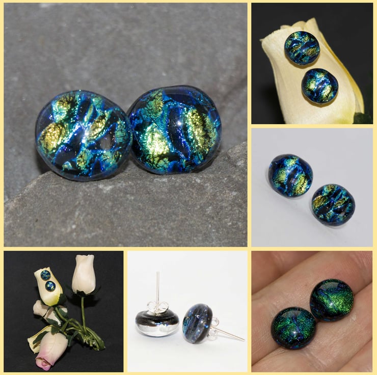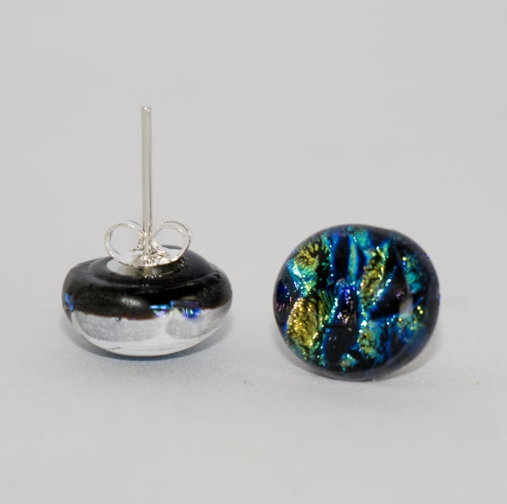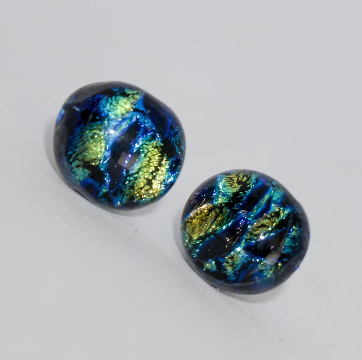 We have a range of earrings created from dichroic glass - we love working with it. The colours that Dichroic Glass show continues to amaze and surprise us. When we open the kiln we are always looking to see what the kiln-fairies have been up to.