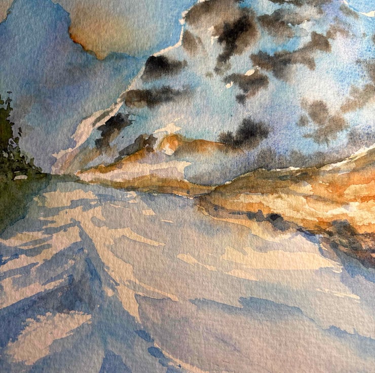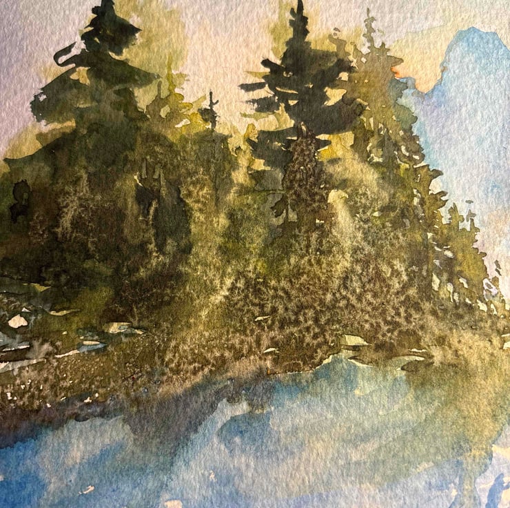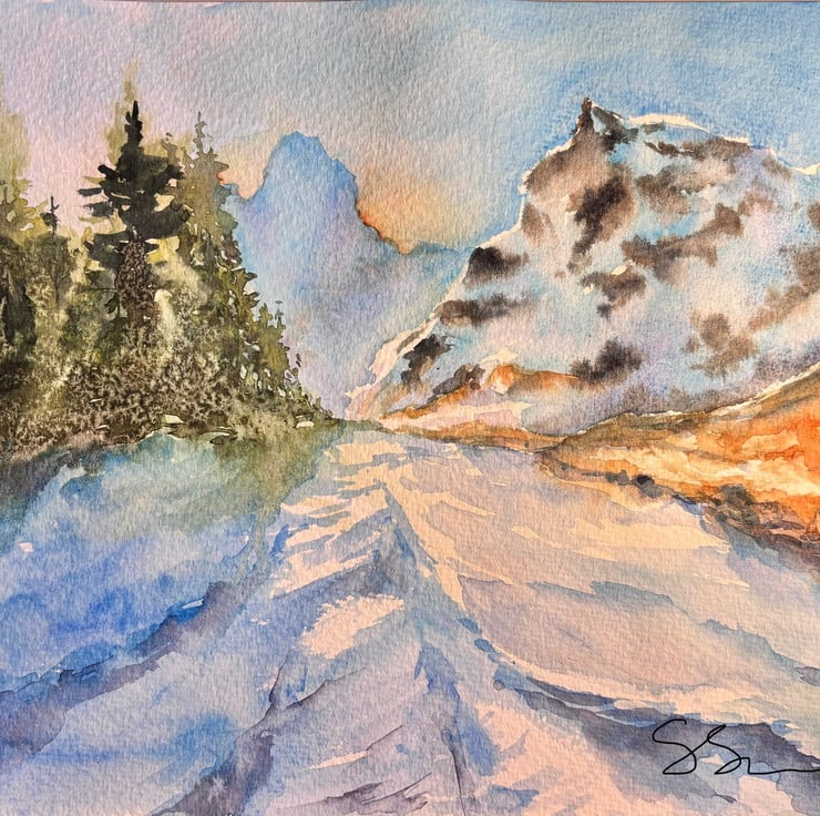 14” x 10” beautiful original watercolour of an evening sunset falling over a snow-heavy trail. A tranquil place to breathe