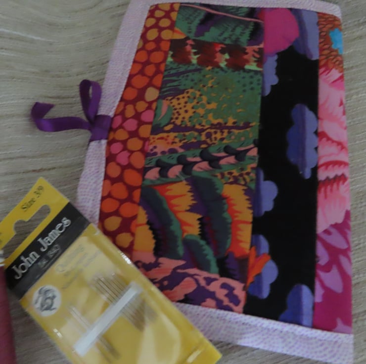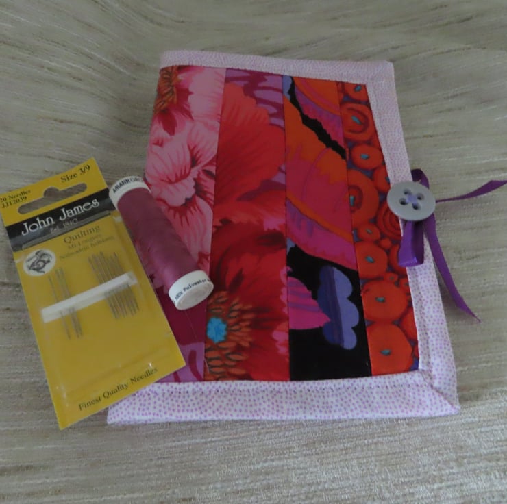 This gorgeous needle case is quilted using Kaffe Fassett fabric in pink tones. The fabric is 100% cotton with a lilac, felt inset to push all of your needles into.