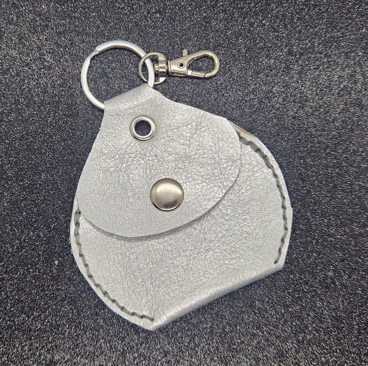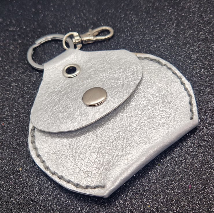Each piece is hand cut and punched, so not digital cut precision, then hand-stitched with a strong waxed co-ordinated braid, again, not machined so not spirit level straight. If you want clone perfection, find it elsewhere. I’ve attached a keyring clasp so can be used as a bag decoration, a on a belt loop or with your car key.