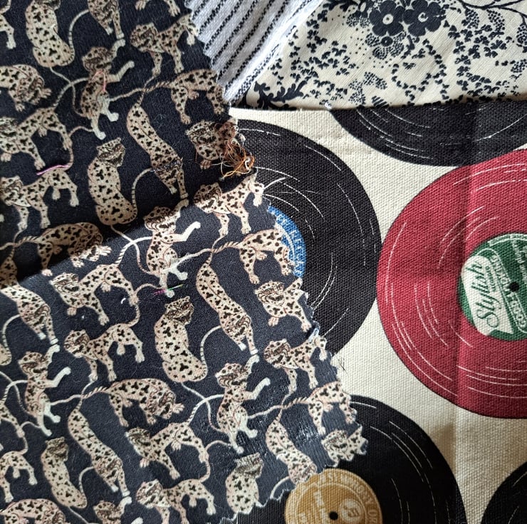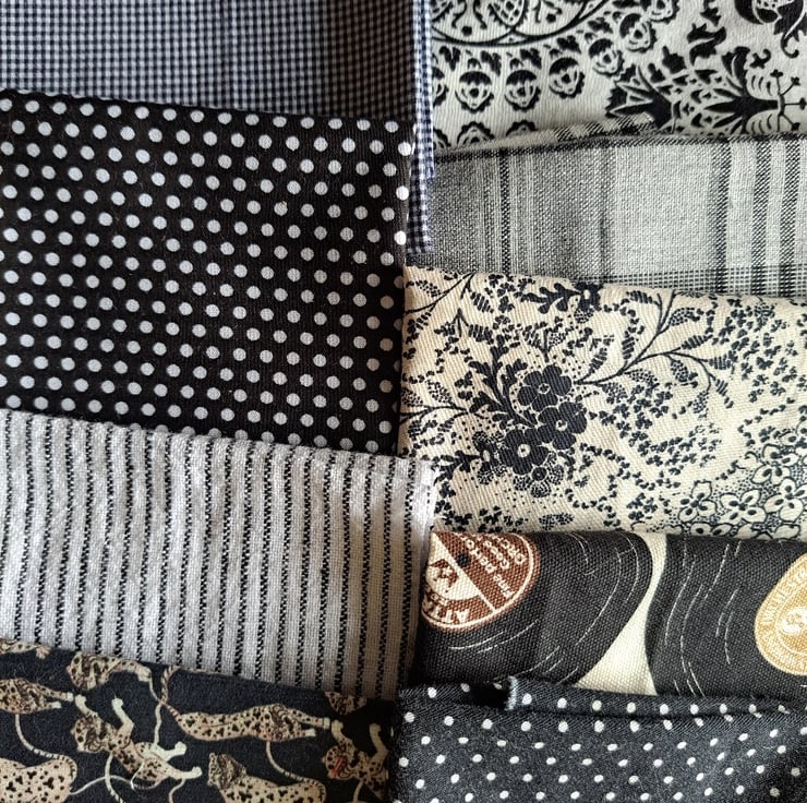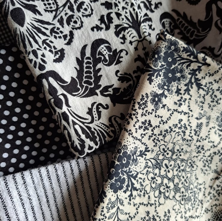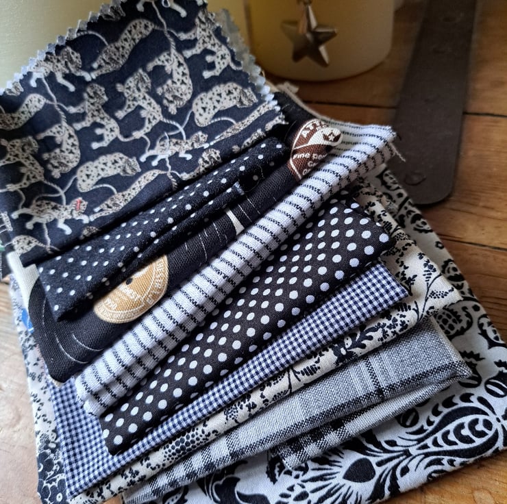 Just because they're black and white doesn't make these fabric pieces boring, as the swirls, spots, records and leopards in this collection will testify. Eight pieces of cotton monochrome fabric, the largest 52cm by 23cm and the smallest 20cm by 15cm.