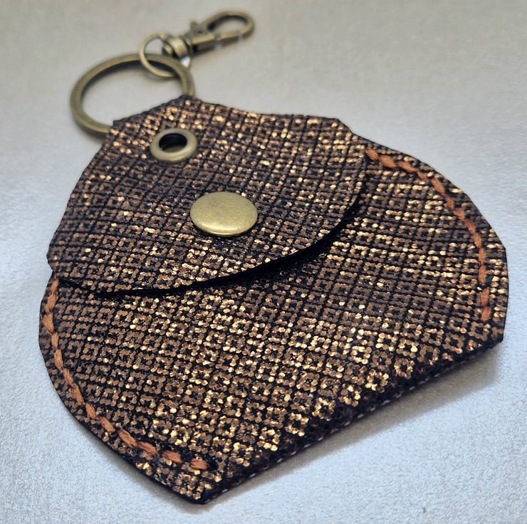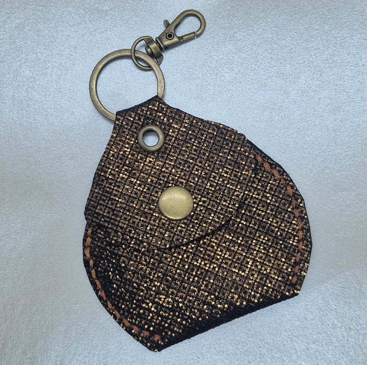 Each piece is hand cut and punched, so not digital cut precision, then hand-stitched with a strong waxed co-ordinated braid, again, not machined so not spirit level straight. If you want clone perfection, find it elsewhere. I’ve attached a keyring clasp so can be used as a bag decoration, a on a belt loop or with your car key.