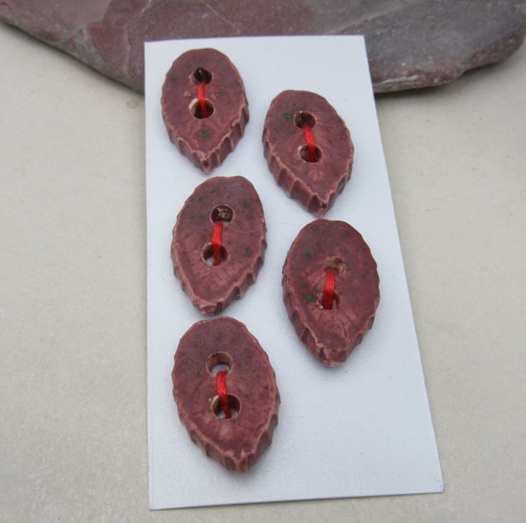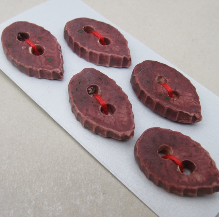 5 Small Leaf Shaped Damson Purple Ceramic Buttons