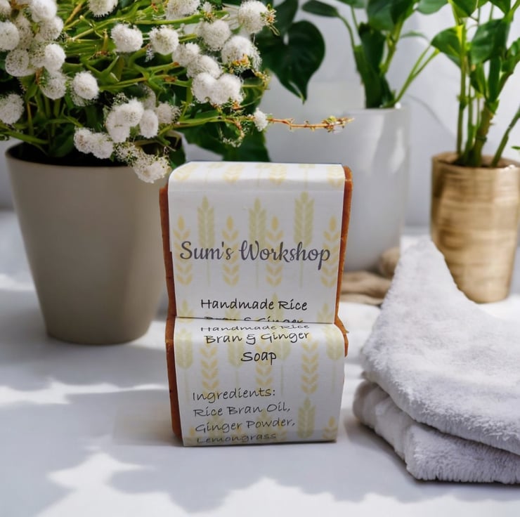 Embrace the natural goodness of our Rice Bran Lemongrass Ginger Soap, made with the nourishing power of pure rice bran oil as the sole carrier oil. Enhanced with the invigorating zest of ginger powder and the refreshing aromas of lemongrass, lemon, and cedarwood essential oils, this soap provides a revitalizing and energizing cleanse. Perfect for all skin types, it gently purifies and rejuvenates your skin, leaving it soft, smooth, and delicately scented. Experience the simplicity and effectiveness of nature with every wash.
