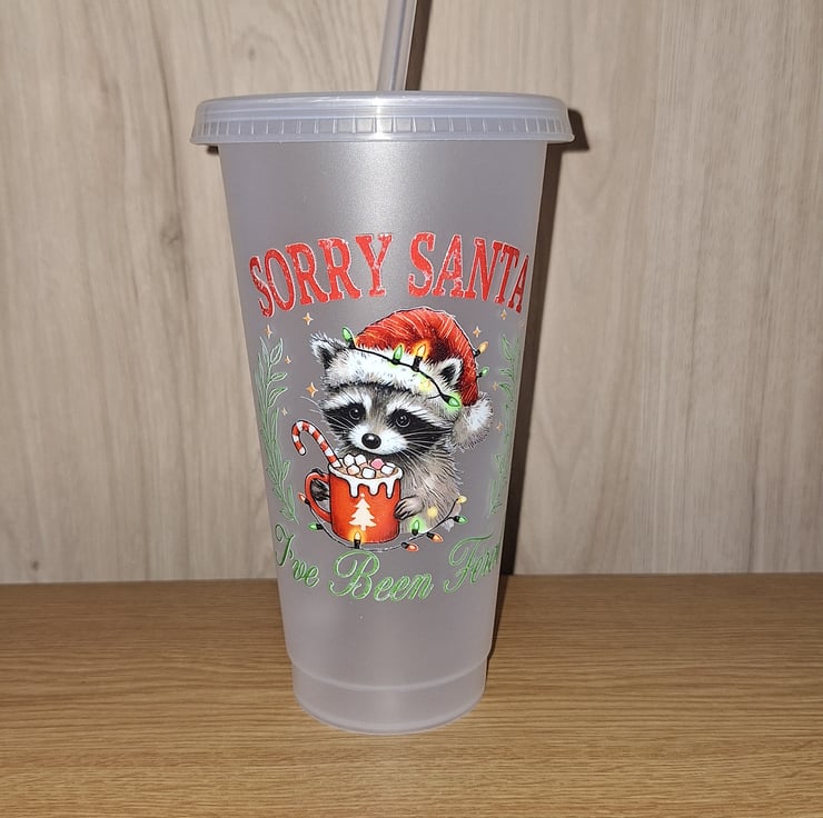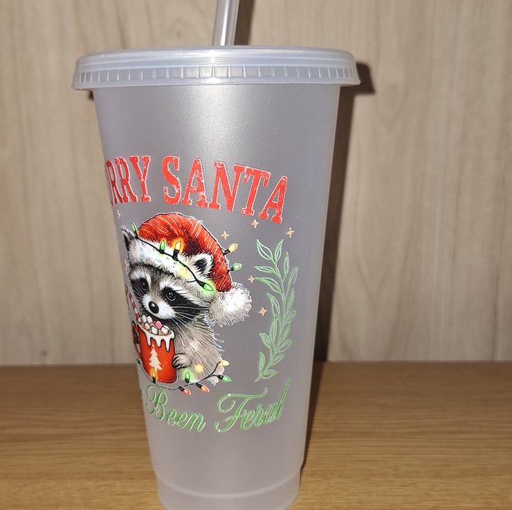A funny cold cup featuring a design "sorry Santa, I've been feral!" and a raccoon with a Christmassy theme! Great for cold or room temp drinks to keep up the festive spirit.