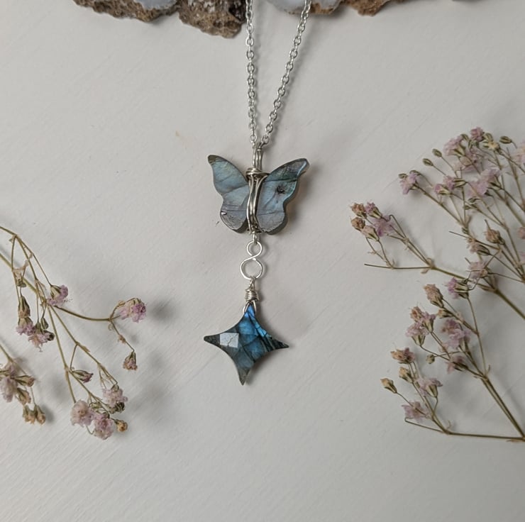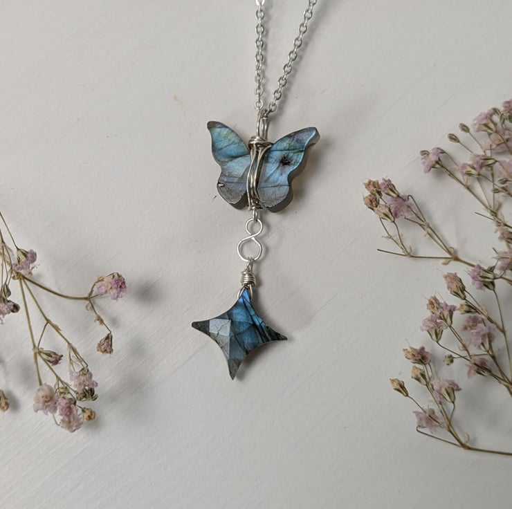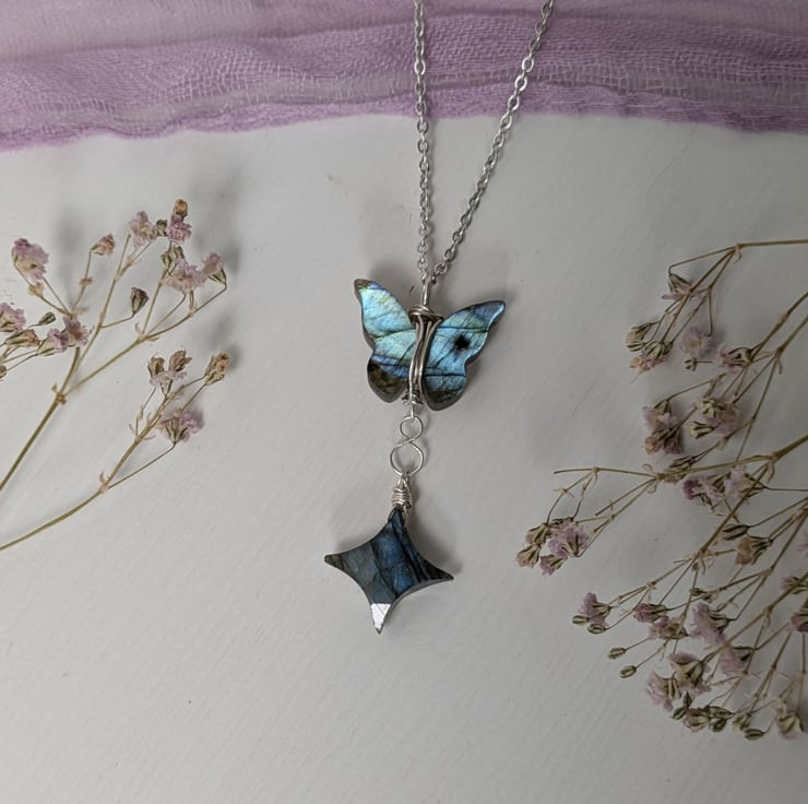 A gorgeous wire wrapped flashy labradorite butterfly and star necklace.