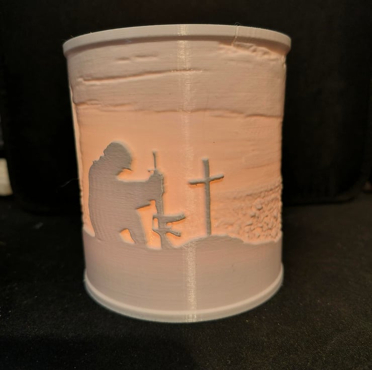 I was making a friend a Lithophane of her pet Dog, that sadly past way, and she was so moved by it that she was very emotional, And as a Proud Supporter of the Armed forces and former TA soldier I was looking at a picture of the Soldier kneeling at the cross. and thought that would make a great Lithophane, so i made it and it really looks amazing at night but also during the day.