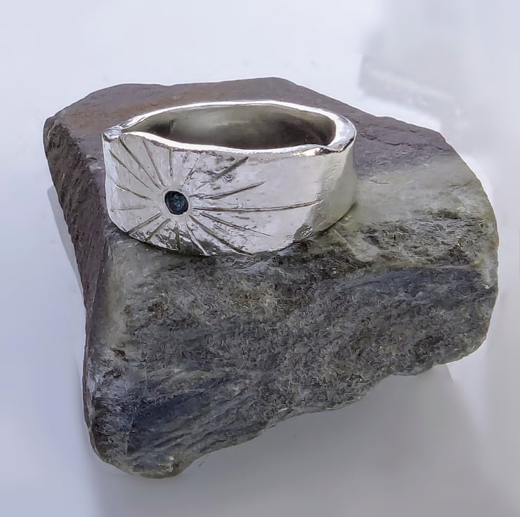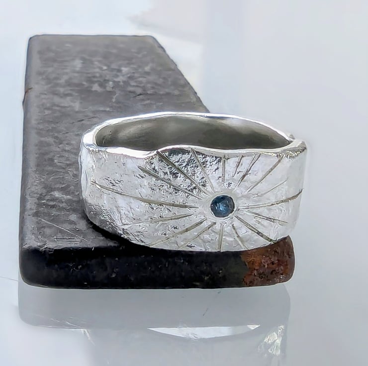 Sterling silver fire textured, hammered & reticulated. Embellished with a blue sapphire gemstones.