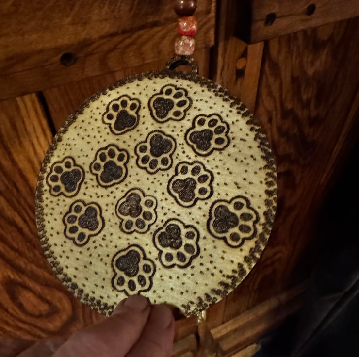 The reverse is illustrated with hand burned paw prints