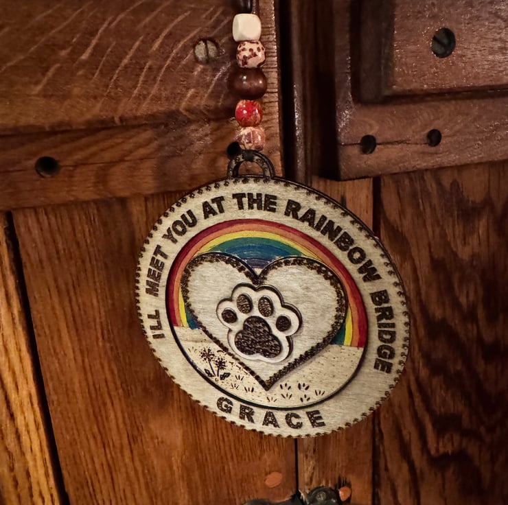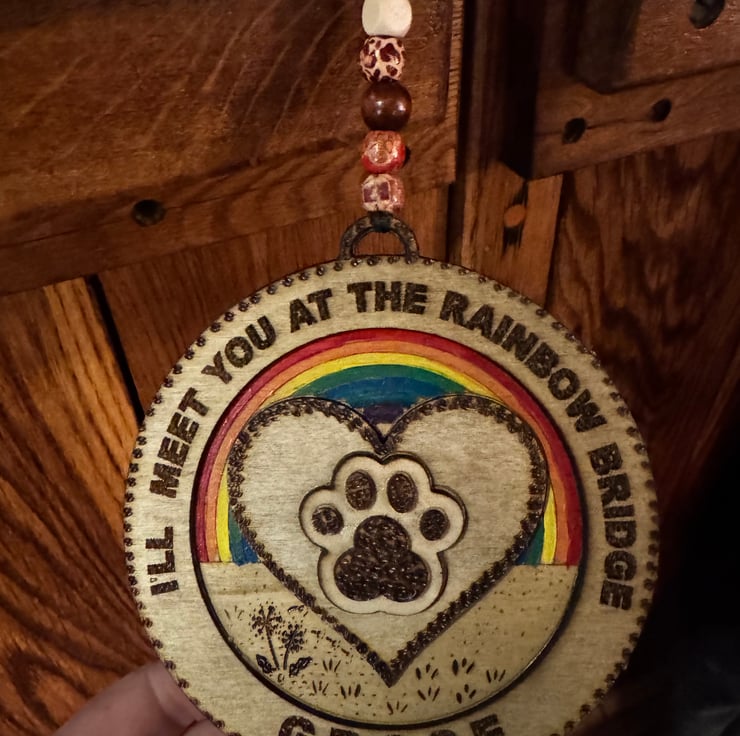 Rainbow bridge personalised pet memorial with hanging thread and beads.