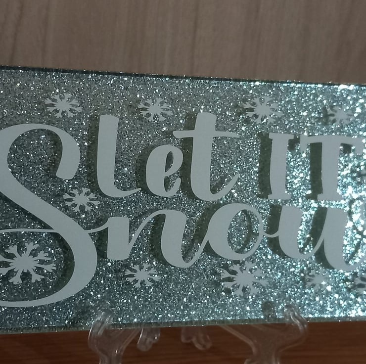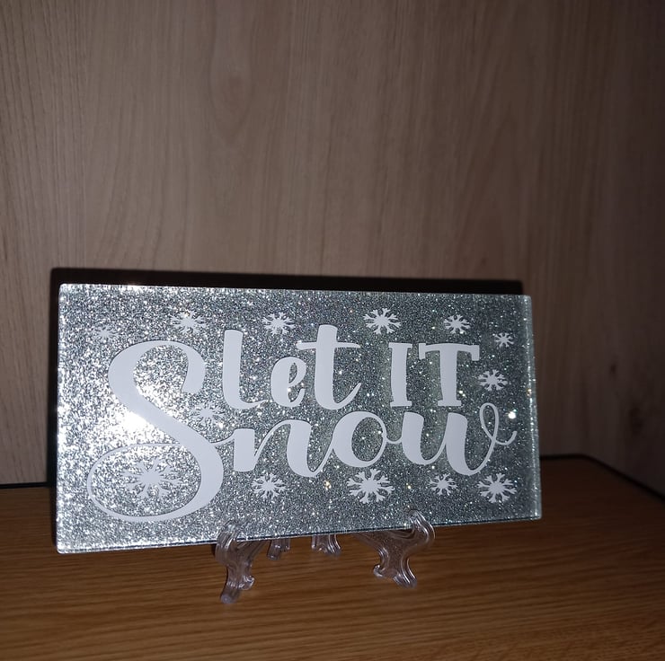 A stunning silver glittery subway tile, decorated with a white vinyl design saying "Let it Snow" with Snowflakes.