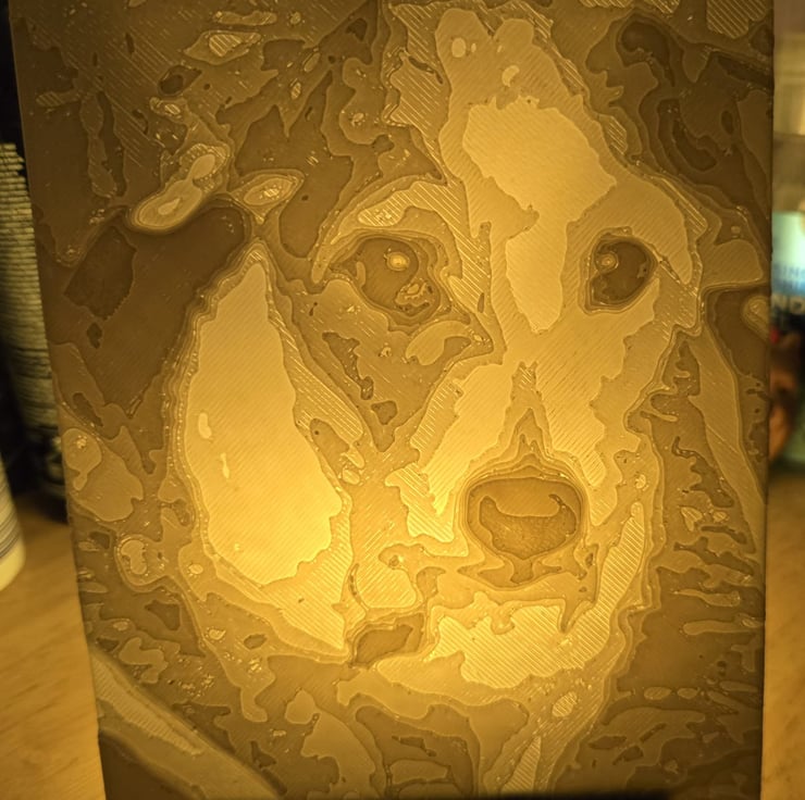This is an example of what I can do, This was a custom order from a Friend who sadly lost her Dog recently, and found it hard to cope. I offered to make this Lithophane for her, and She loved it so much, and her friends also loved. it.