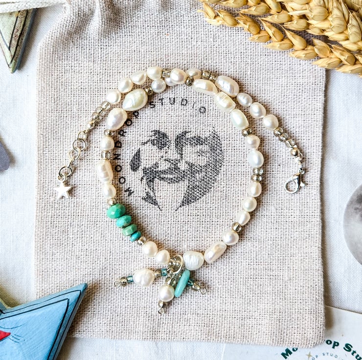 Celestial Freshwater Pearl & Turquoise Gemstone Necklace, Gift For Pisces