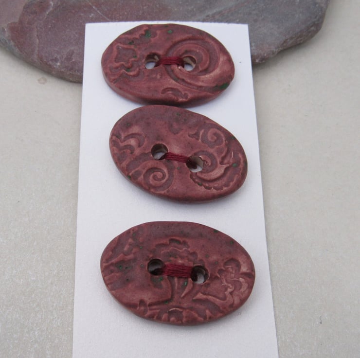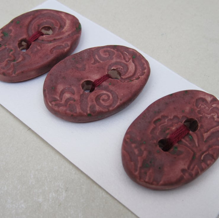 3 medium sized stoneware buttons, with a pretty brocade motif printed into the upper face. Finished with a matte speckled damson purple glaze.