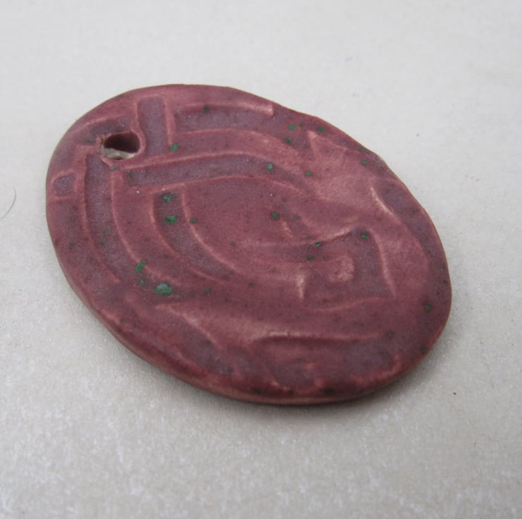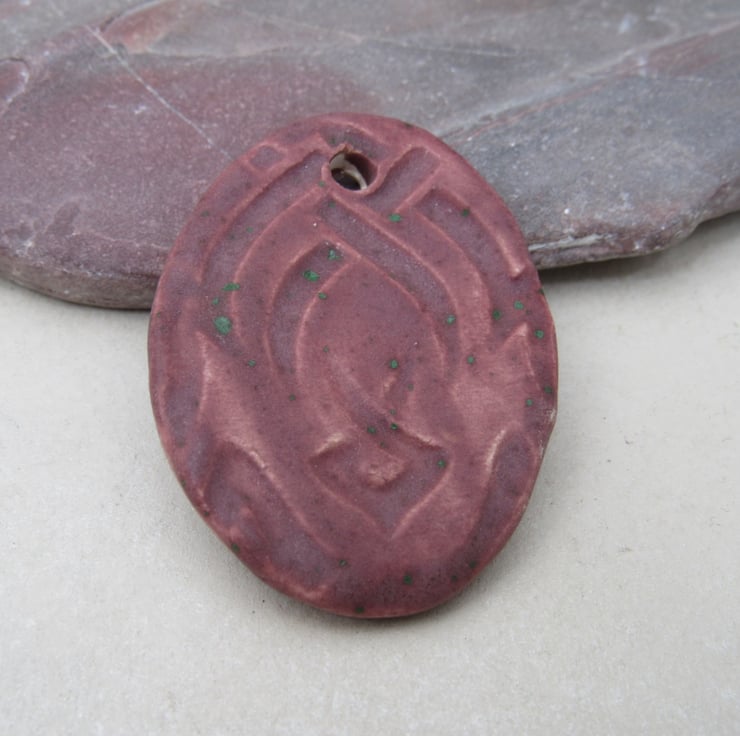 Large stoneware ceramic pendant, patterned with an embossed design of celtic knotwork, and finished with a matte speckled damson purple glaze.