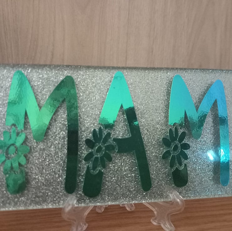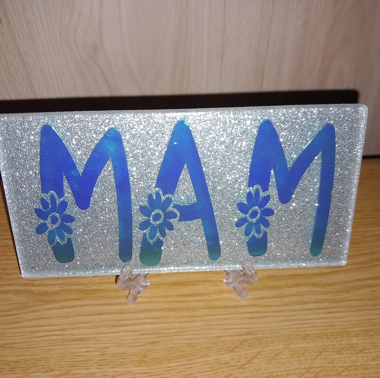 A stunning silver glittery subway tile, decorated with a holographic blue-green vinyl design saying "Mam". Great gift for mother's day, birthday or Christmas!
