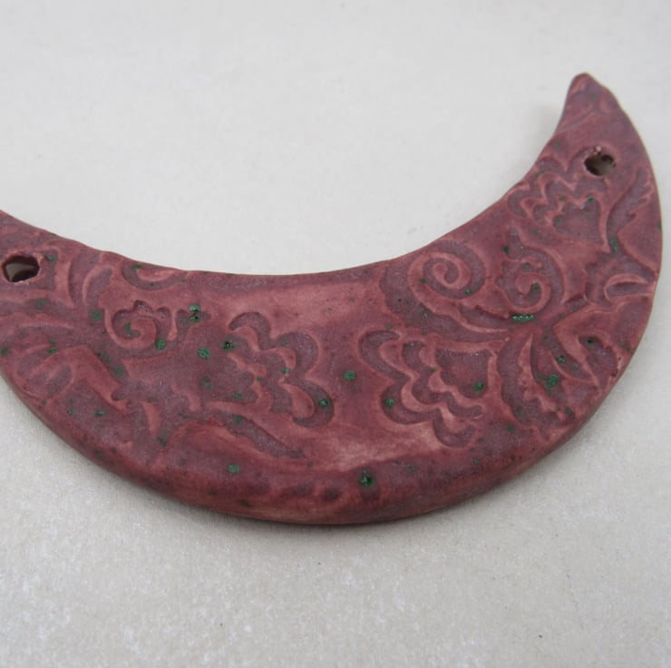 Damson purple ceramic bib pendant patterned with textured leaves and flowers