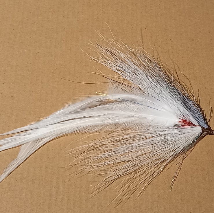 Pike perch and zander hand made fly using synthetic fibers and feathers 3D eyes tied on a Gamatsu SL12S hook 13cm long