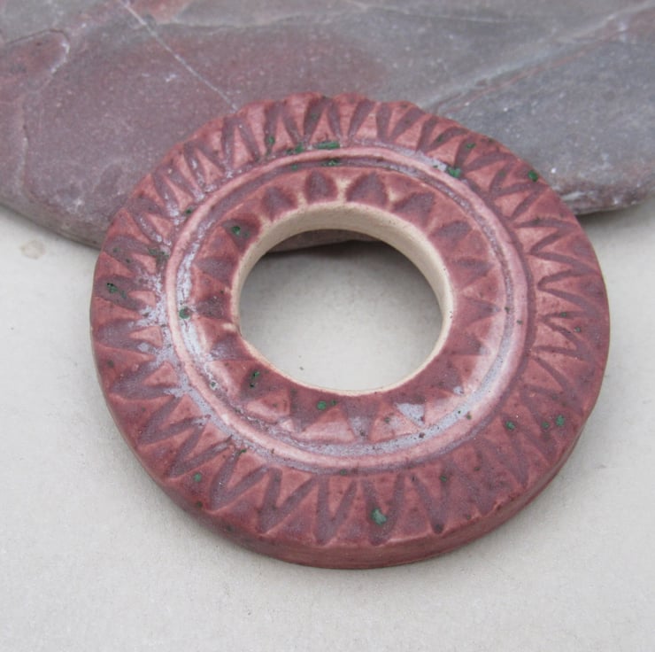 Circular ceramic loop patterned with embossed linear designs and finished with a matte damson purple glaze.