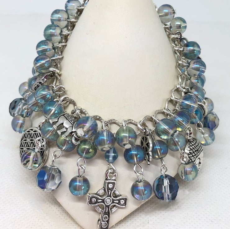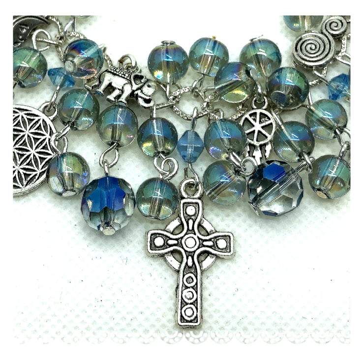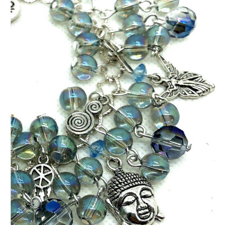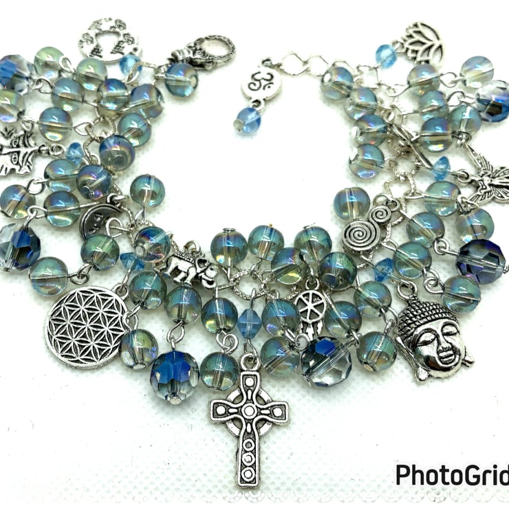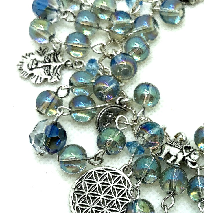 Created using assorted spiritual charms, glass faceted AB beads & AB lustre glass beads.