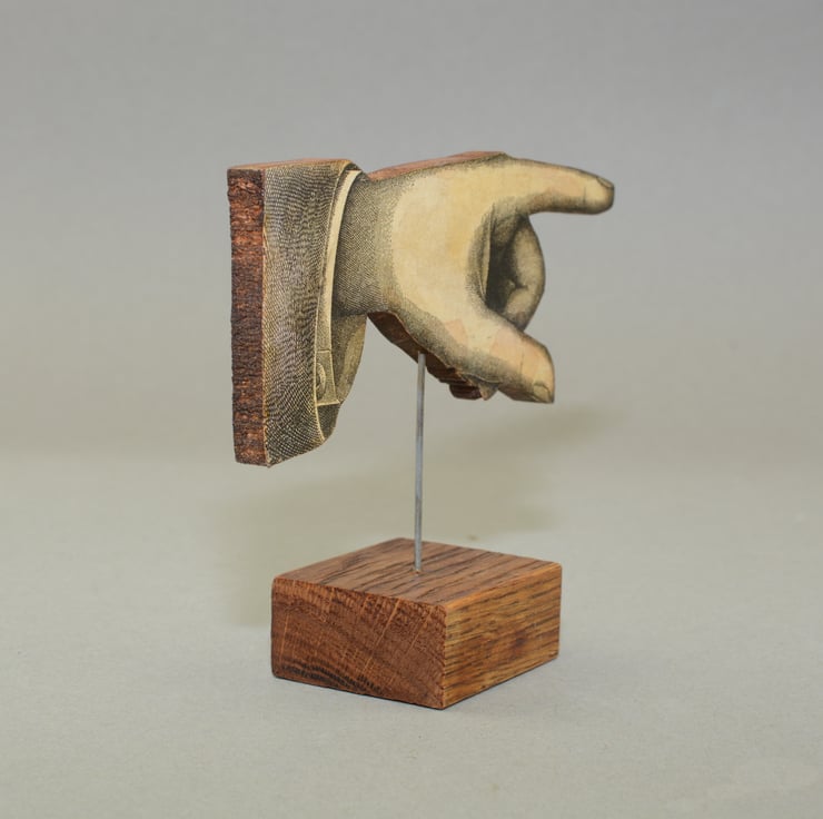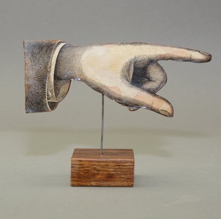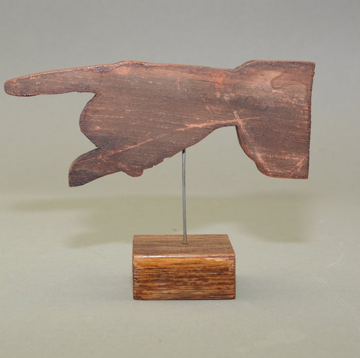 A wooden shop direction pointing hand sign. 10.2cms tall, 13.5cms wide and 4cms deep.