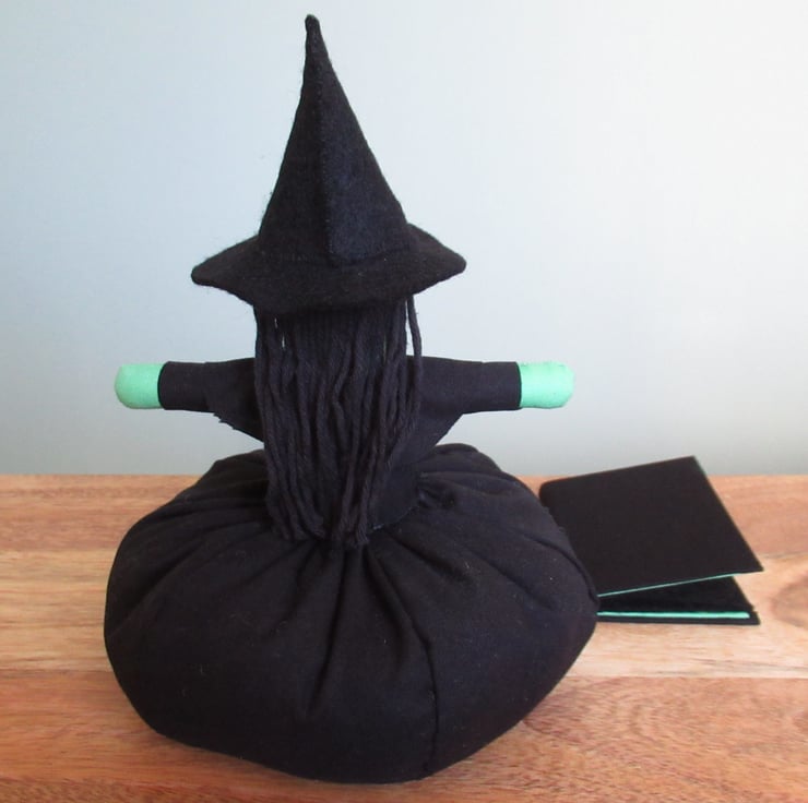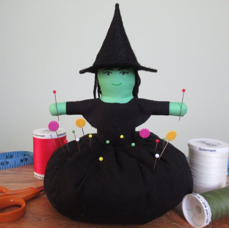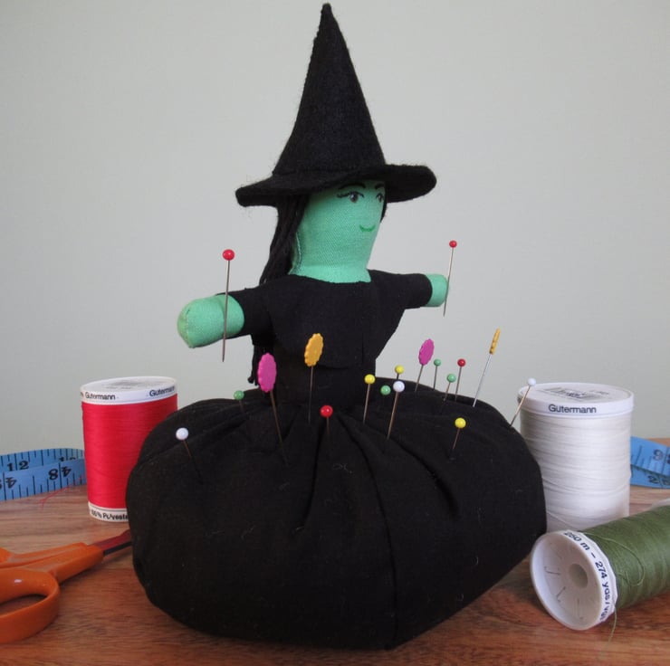 The witch measures approximately 15x15x15cm (6x6x6 inches). The needle case measures 6x9cm when closed. See my shop for other versions of the Sewing Companion.
