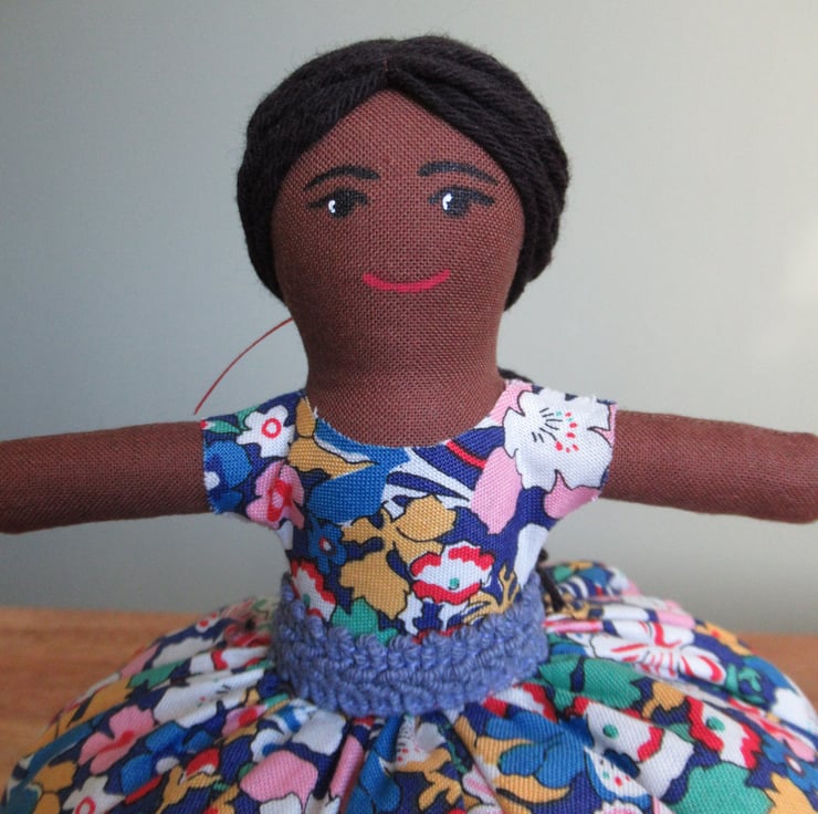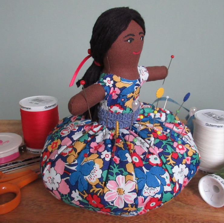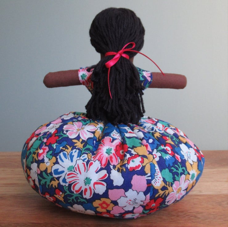 Each lady is a unique combination of fabric prints, colours and accessories (see my shop for other versions). She measures approximately 15x15x15cm (6x6x6 inches). The needle case measures 6x9cm when closed.