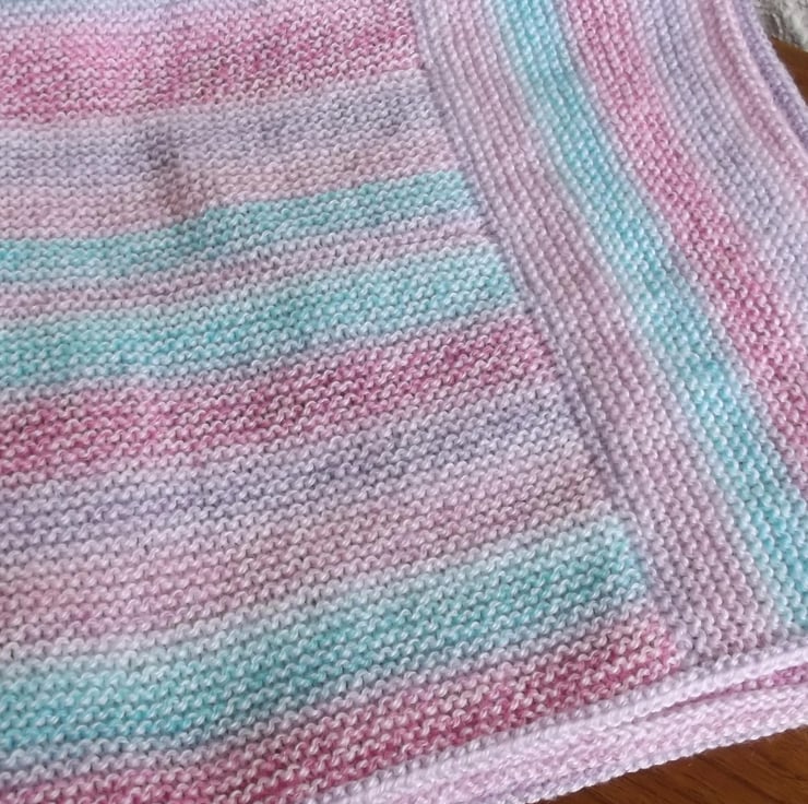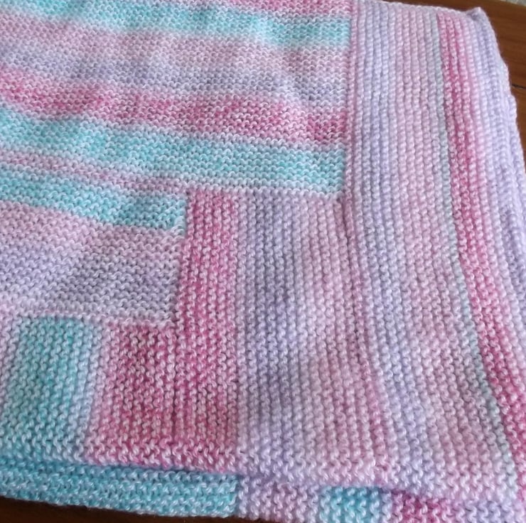 Hand knitted by me. Pink and Aqua Log Cabin Style Cot Blanket. Measures 76cm (30 inches) by 66cm (26 inches). Knitted in medium weight acrylic blend yarn. hm68