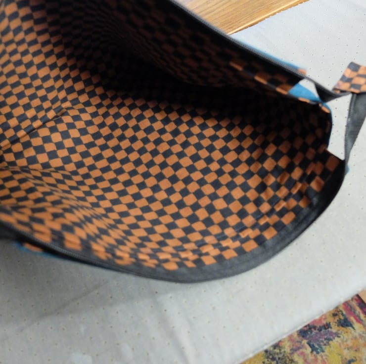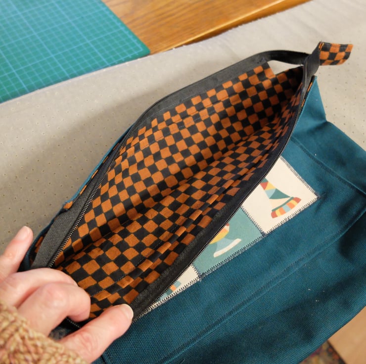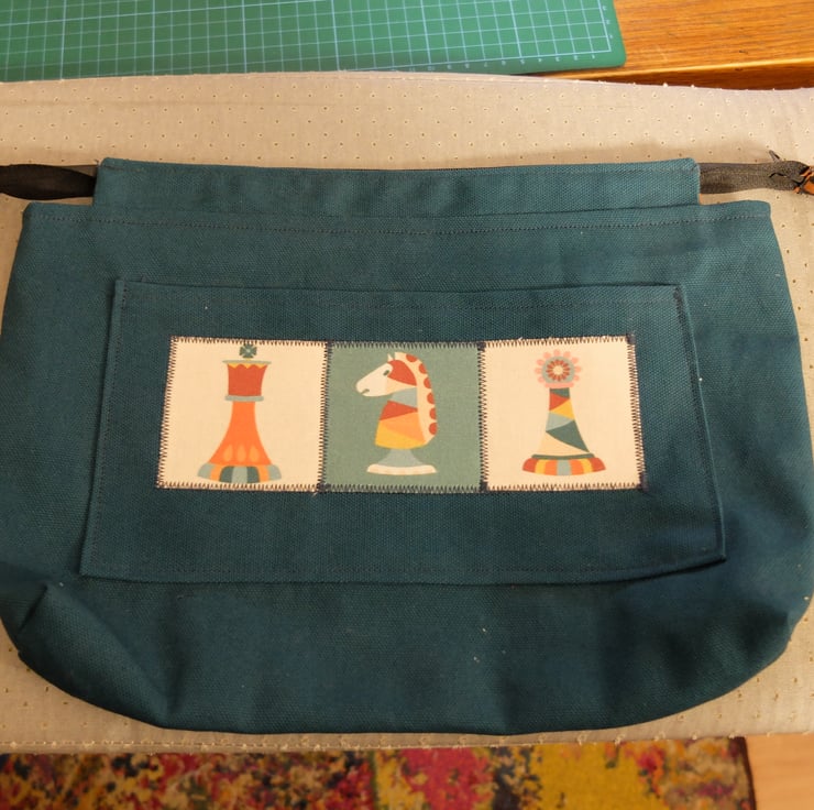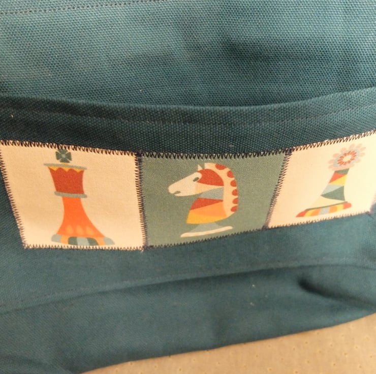 Made in a Jade canvas fabric, with a pocket to the front, applique chess pieces for decoration.