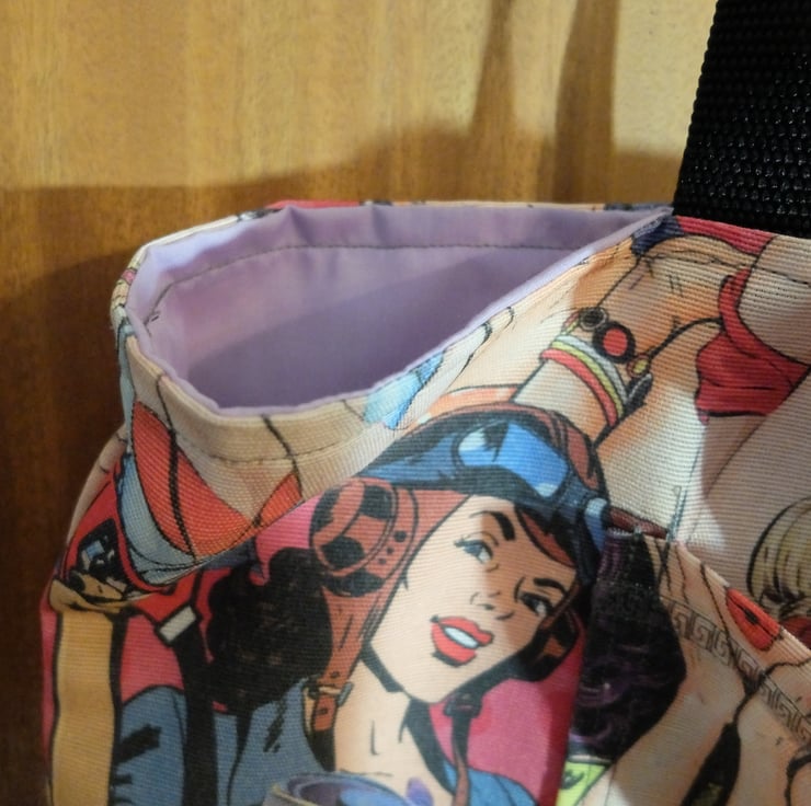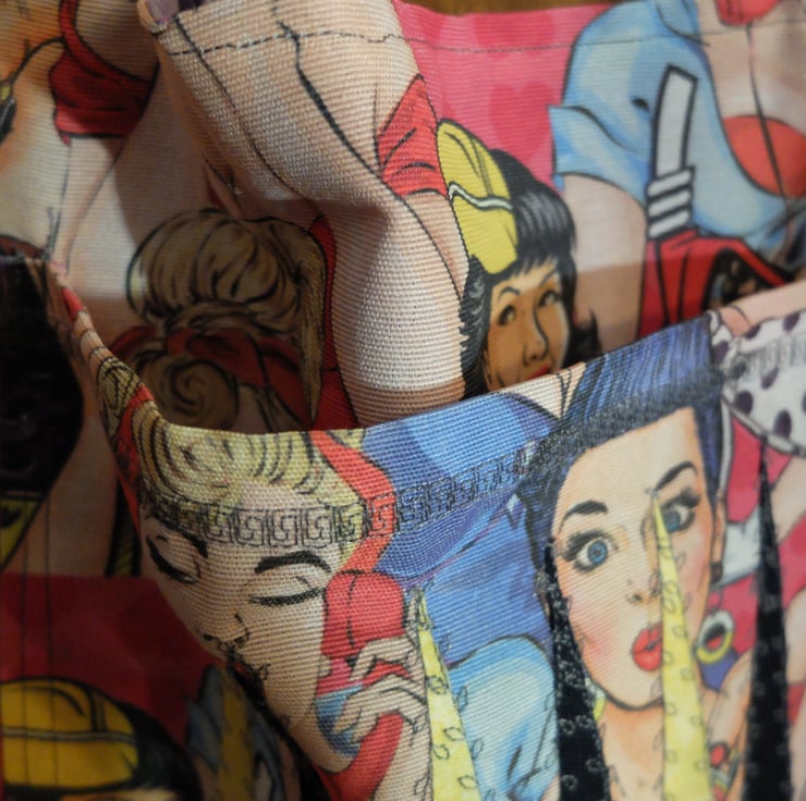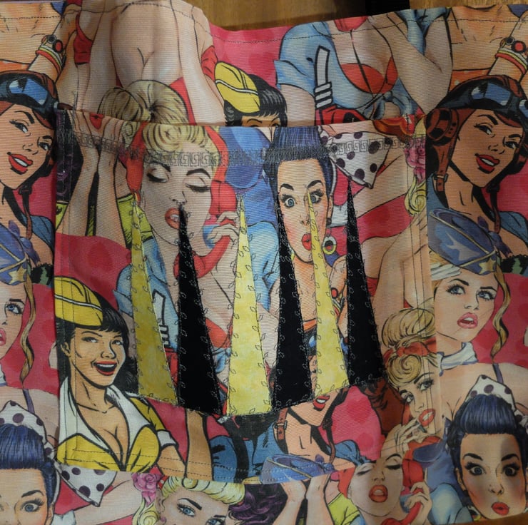 This is in a pin-up girls pattern canvas. Measures 48cm x 34cm laid flat.
