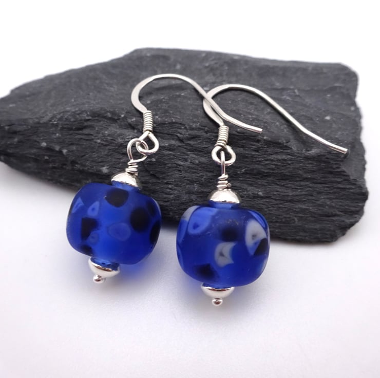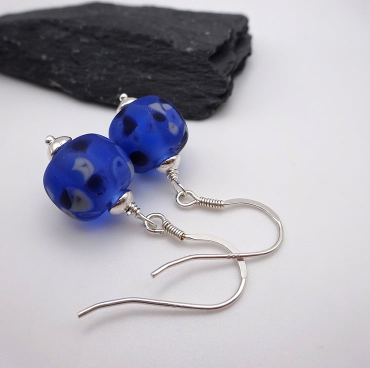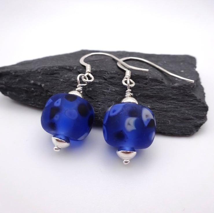 A pair of earrings made with sterling silver ear wires and handmade lampwork glass blue frosted beads.